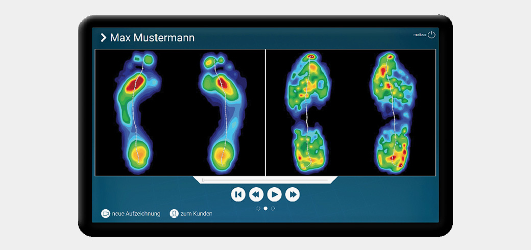 Innerhalb weniger Sekunden wird ein genaues Bild erfasst und in Echtzeit auf dem integrierten Bildschirm angezeigt. Bis zu 22.000 hochwertige Sensoren aus der Medizintechnik bilden die individuelle Druckverteilung präzise ab. Auf diese Weise sind wir in der Lage, die Druckverteilung und die Abrollbewegung des Fusses sehr genau zu erfassen.